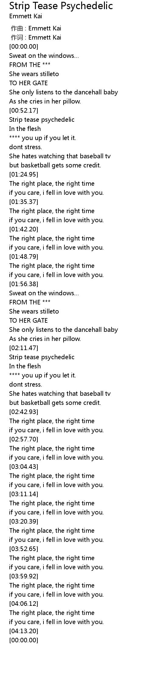 | [04:00.41] | The right place, the right time |