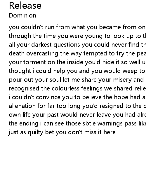 | you couldn't run from what you became from one who would vent his revenge through the time you were young to look up to the put downs he gave instead in all your darkest questions you could never find the answers this chance with death overcasting the way tempted to try the peace you could give you would wear your torment on the inside you'd hide it so well until you released it again i thought i could help you and you would weep to me reveal this withered spirit pour out your soul let me share your misery and sometimes i saw myself in you recognised the colourless feelings we shared relief in knowing we were not alone i couldn't convince you to believe the hope had already gone you'd suffered alienation for far too long you'd resigned to the description when you took your own life your past would never leave you had already died the night you chose the ending i can see those sbtle warnings pass like it was meant to be but i am just as quilty bet you don't miss it here |