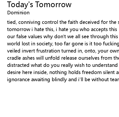| tied, conniving control the faith deceived for the sake of today we have sold tomorrow i hate this, i hate you who accepts this lie in silence i hate this, our false values why don't we all see through this unheard, fixed in your own world lost in society, too far gone is it too fucking late? i hate this i hate a veiled invert frustration turned in, onto, your own from the hand that rocks the cradle ashes will unfold release ourselves from these actions how you keep us distracted what do you really wish to understand exactly what's behind your real desire here inside, nothing holds freedom silent and we will die in our own ignorance awaiting blindly and i'll be without tears |