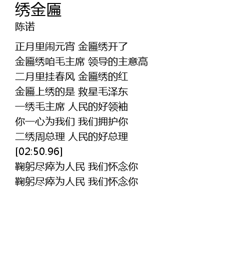 | [00:43.93] | 金匾绣咱毛主席 领导的主意高 |