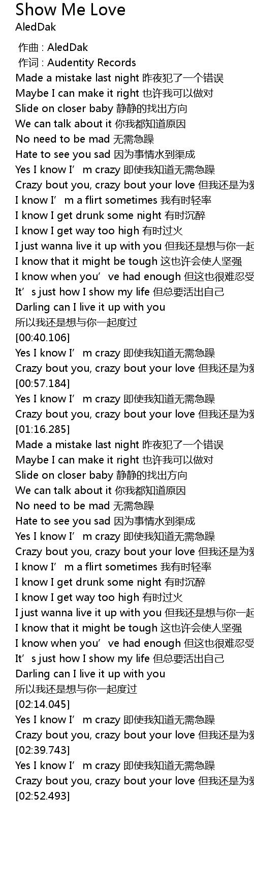 | [02:49.997] | Crazy bout you, crazy bout your love dan wo hai shi wei ai feng kuang |