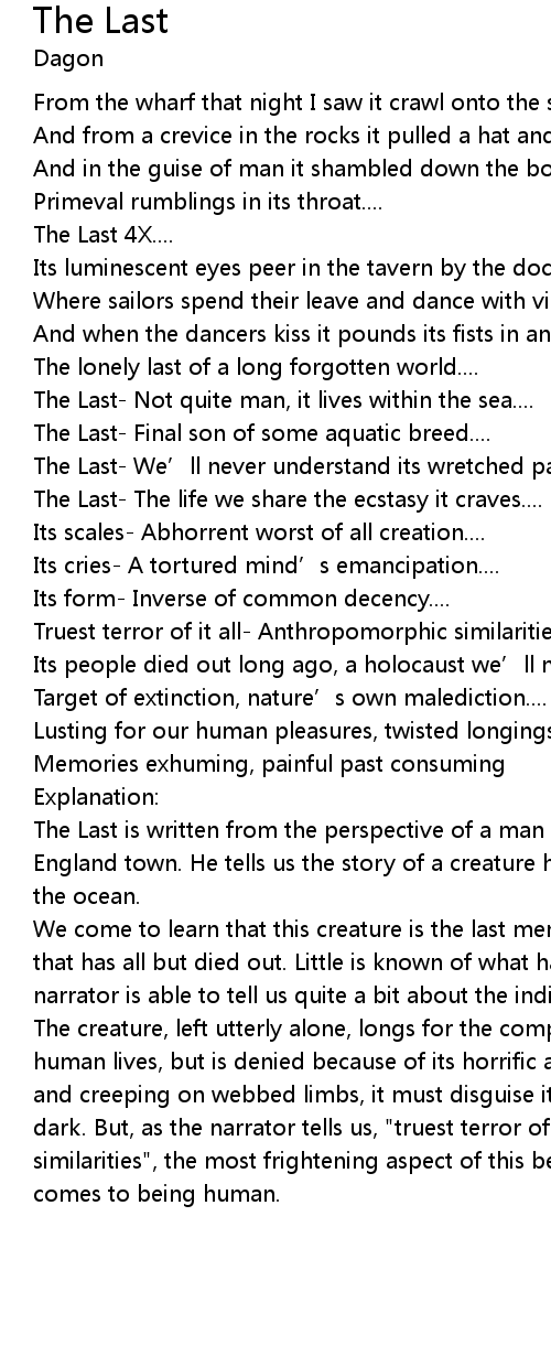 | The Last is written from the perspective of a man who lives in a seaside New England town. He tells us the story of a creature he has seen crawling out of the ocean. | |