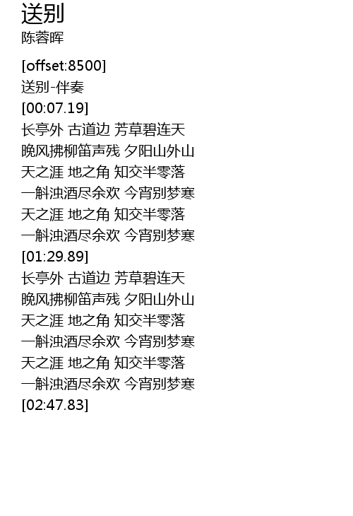 | [01:30.19] | 长亭外 古道边 芳草碧连天 |