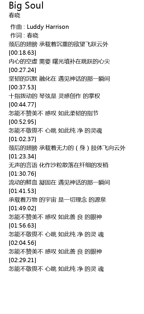 | [01:58.26] | 怎能不敬畏不 心跳 如此纯 净 的灵 魂 |