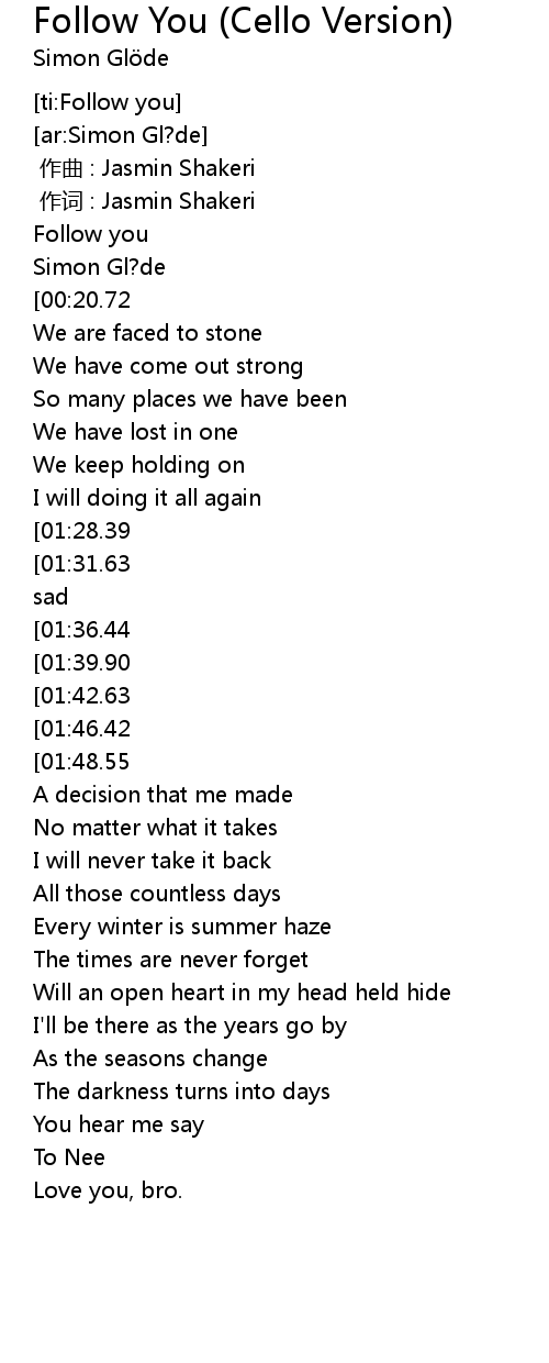 | [00:36.96][01:28.39][02:19.31] | I will follow you uphill |