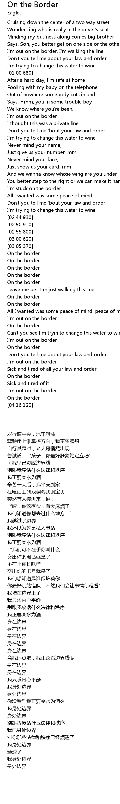 | [02:26.910] | I' m stuck on the border |