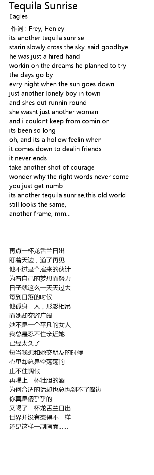| [00:16.340] | its another tequila sunrise |
