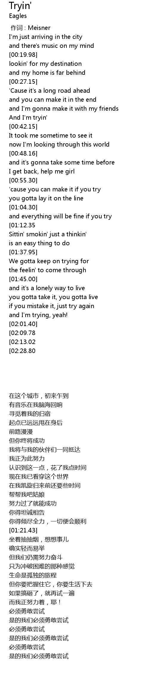 | [02:16.77][02:09.78][02:02.67] | Got to keep on trying |