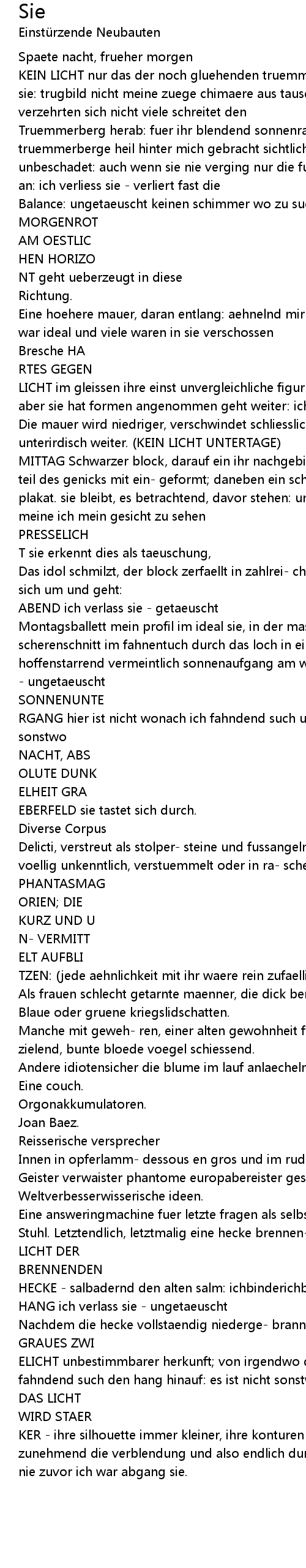 Truemmerberg herab: fuer ihr blendend sonnenrad der macht doch habe ich ihre truemmerberge heil hinter mich gebracht sichtlich angeschlagen, aber unbeschadet: auch wenn sie nie verging nur die fuer sie vergingen kommt unten an: ich verliess sie - verliert fast die |