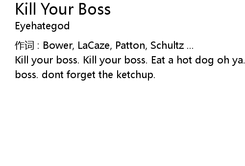 | Kill your boss. Kill your boss. Eat a hot dog oh ya. Kill your boss. Kill your boss. dont forget the ketchup. |