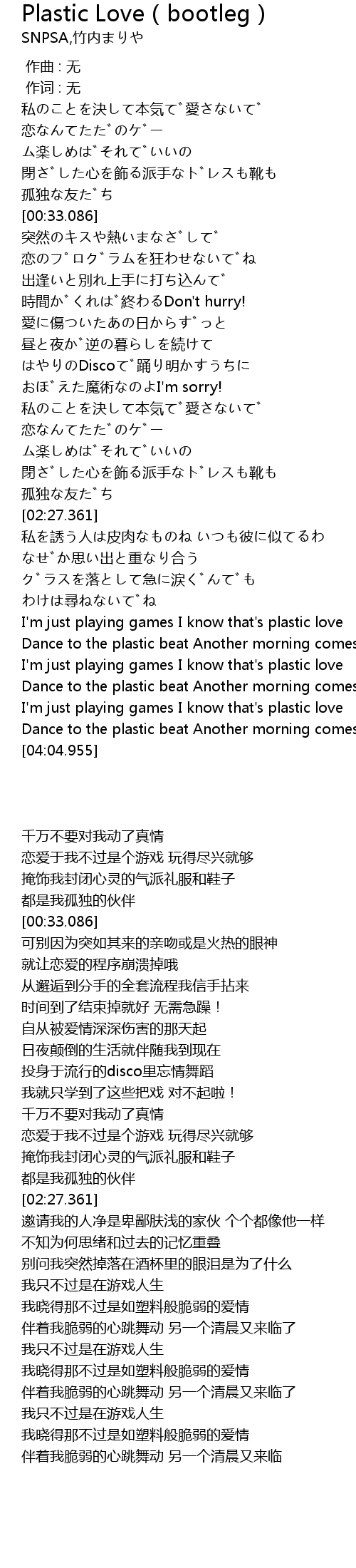| [03:31.571] | I'm just playing games I know that's plastic love |