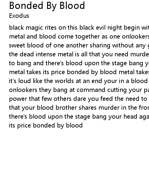 black magic rites on this black evil night begin with the slice of the blade metal and blood come together as one onlookers they gasp in dismay taste the sweet blood of one another sharing without any greed bang you head as if up from the dead intense metal is all that you need murder in the front row crowd begins to bang and there's blood upon the stage bang you head against the stage and metal takes its price bonded by blood metal takes hold death starts to unfold it's loud like the worlds at an end your in a blood fury the metal won't stop onlookers they bang at command cutting your palm and drinking your blood the power that few others dare you feed the need to go out and kill the same need that your blood brother shares murder in the front row crowd begins to bang and there's blood upon the stage bang your head against the stage and metal takes its price bonded by blood