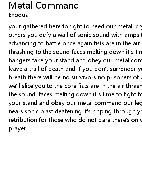 your gathered here tonight to heed our metal. cry obeying all. our wills all others you defy a wall of sonic sound with amps turned up to ten our legions are advancing to battle once again fists are in the air. banging everywhere thrashing to the sound faces melting down it s time to fight for metal tonight bangers take your stand and obey our metal command we go from town to town and leave a trail of death and if you don't surrender you'll breathe you final breath there will be no survivors no prisoners of war join our ranks or perish we'll slice you to the core fists are in the air thrashing everywhere banging to the sound, faces melting down it s time to fight for metal tonight bangers take your stand and obey our metal command our legions show no mercy the final hour nears sonic blast deafening it's ripping through your ears there is no retribution for those who do not dare there's only execution your dead without a prayer |