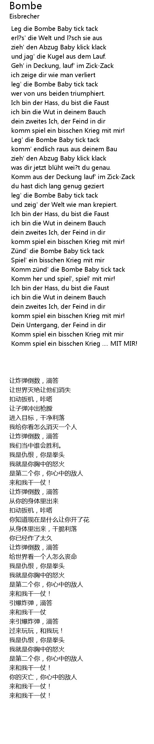 | [00:00.300] | Leg die Bombe Baby tick tack |