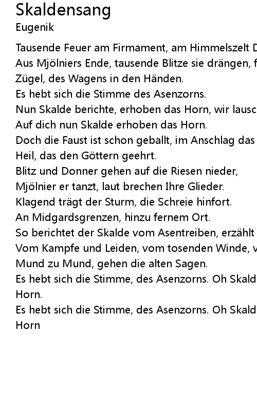 | Es hebt sich die Stimme, des Asenzorns. Oh Skalde berichte, auf dich erhoben das Horn |