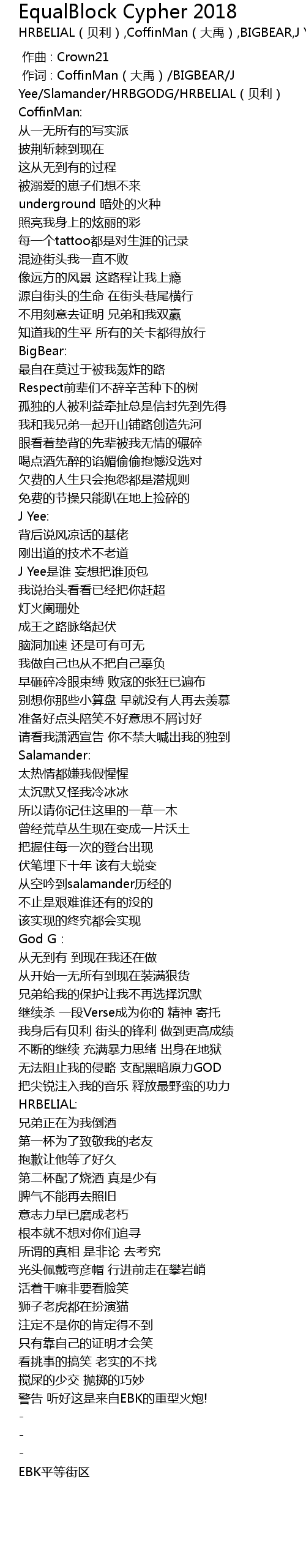 | [00:01.000] | 作词 : CoffinMan(大禹)/BIGBEAR/J Yee/Slamander/HRBGODG/HRBELIAL(贝利) |