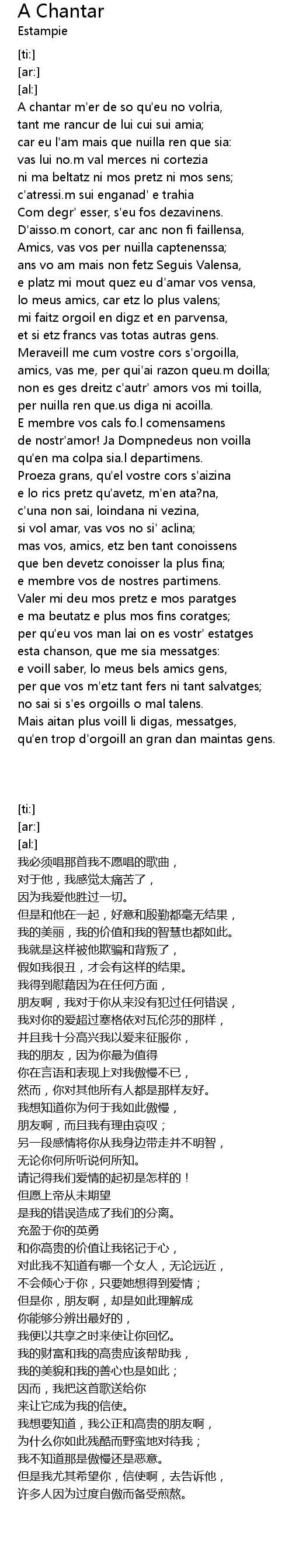 | [00:02.62] | A chantar m'er de so qu'eu no volria, |
