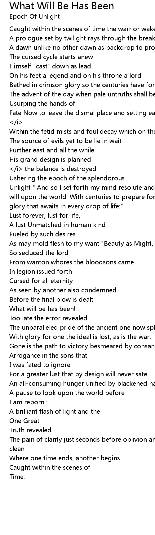 Unlight ":And so I set forth my mind resolute and might unchecked to rend my will upon the world. With centuries to prepare for the final battle and the glory that awaits in every drop of life:" |