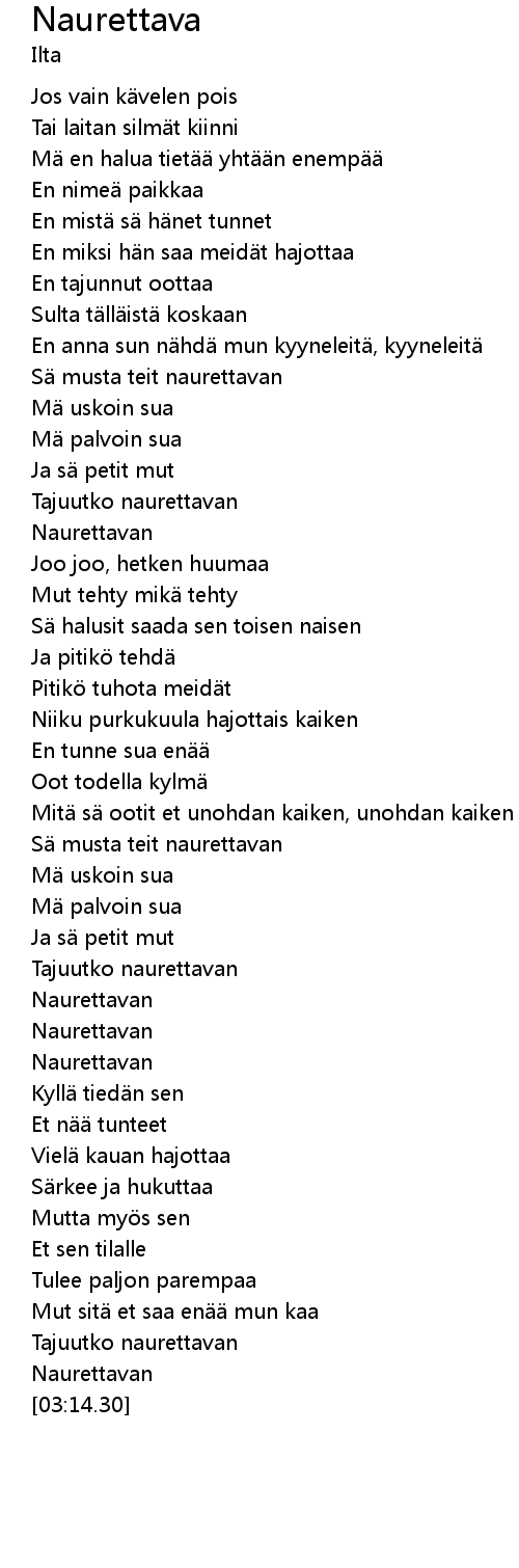| [02:10.94] | Naurettavan |