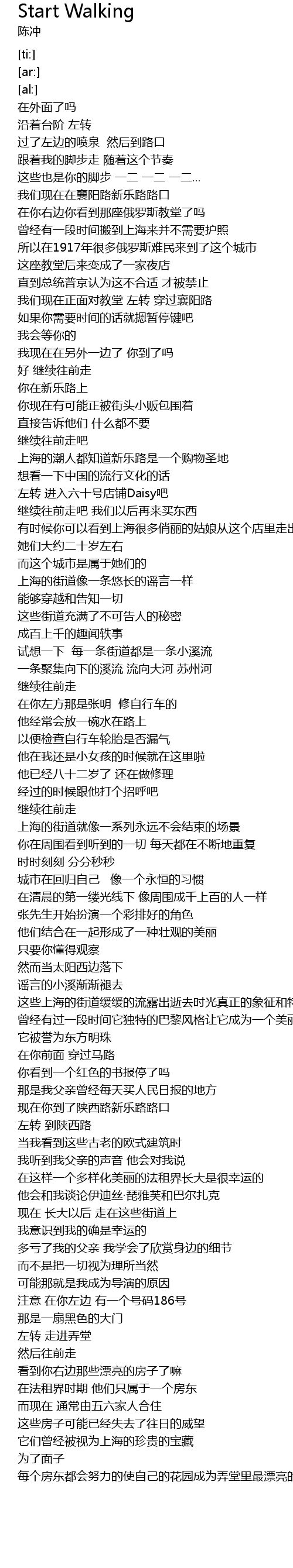 | [04:26.49] | 这些上海的街道缓缓的流露出逝去时光真正的象征和特点 |