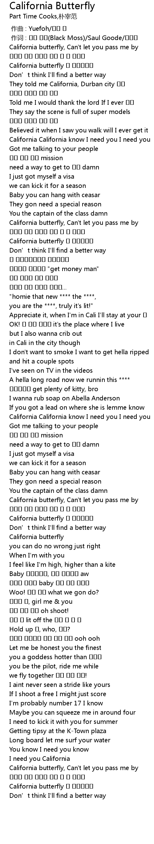 | [00:32.60] | California butterfly 날 지나가지마 |