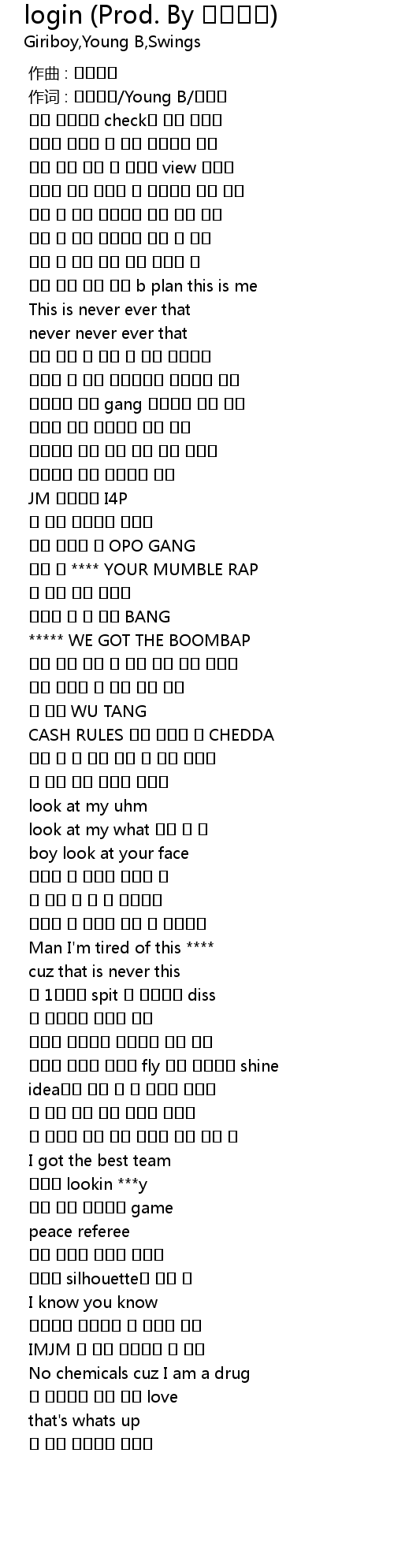 | [00:01.000] | 作词 : 기리보이/Young B/스윙스 |