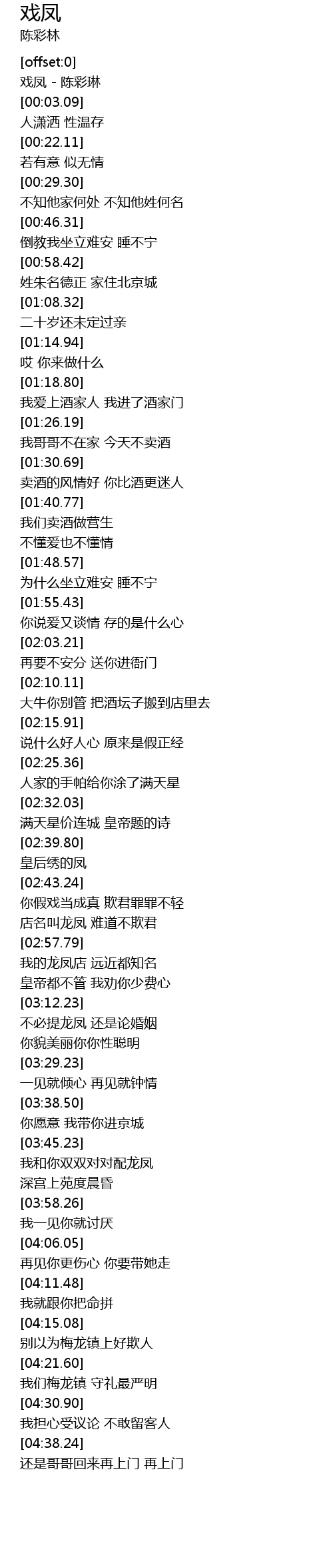 | [00:00.44] | 戏凤 - 陈彩琳 |