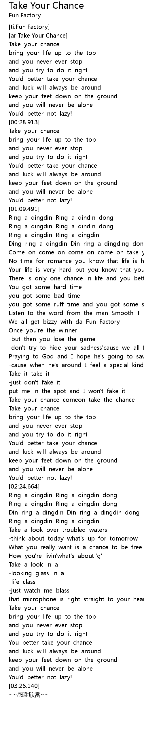 | [01:29.953] | Come on come on come on come on take your chance |
