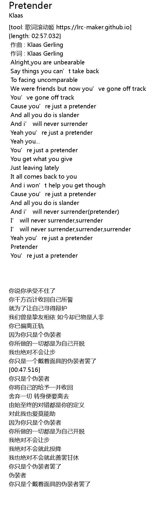 | [01:55.285] | And i’ will never surrender(pretender) |