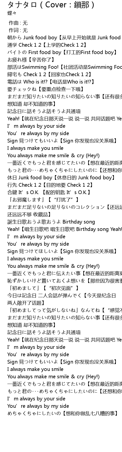 | [01:42.92] | 誕生日歌おうよ歌おうよ Birthday song Yeah!【唱生日歌吧 唱生日歌吧 Birthday song Yeah!】 |