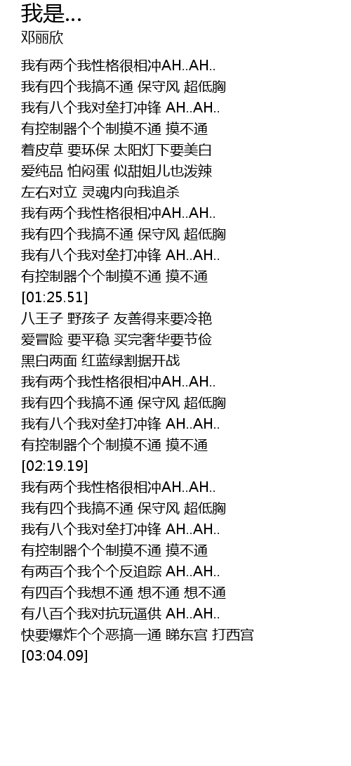 | [01:07.72] | wǒ yǒu liǎng gè wǒ xìng gé hěn xiāng chōng AH.. AH.. |