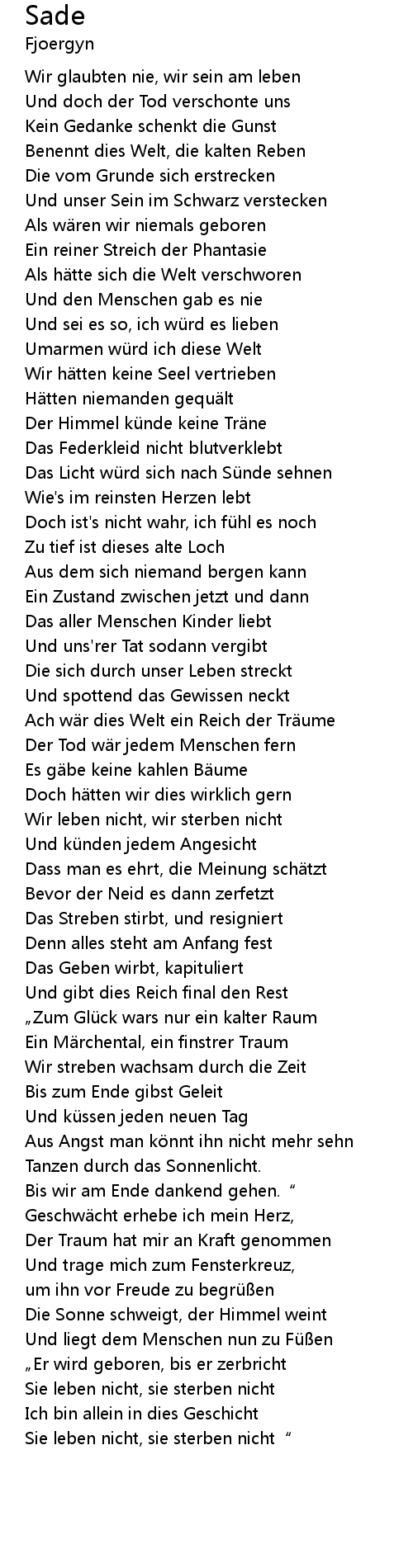 | Bis wir am Ende dankend gehen.“ | |