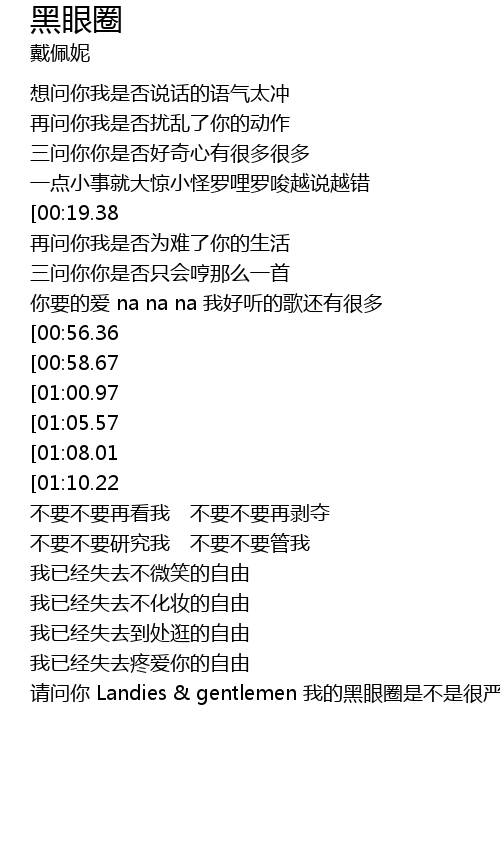 | [01:19.80][00:19.38][00:10.07] | 想问你我是否黑眼圈有一点重 |