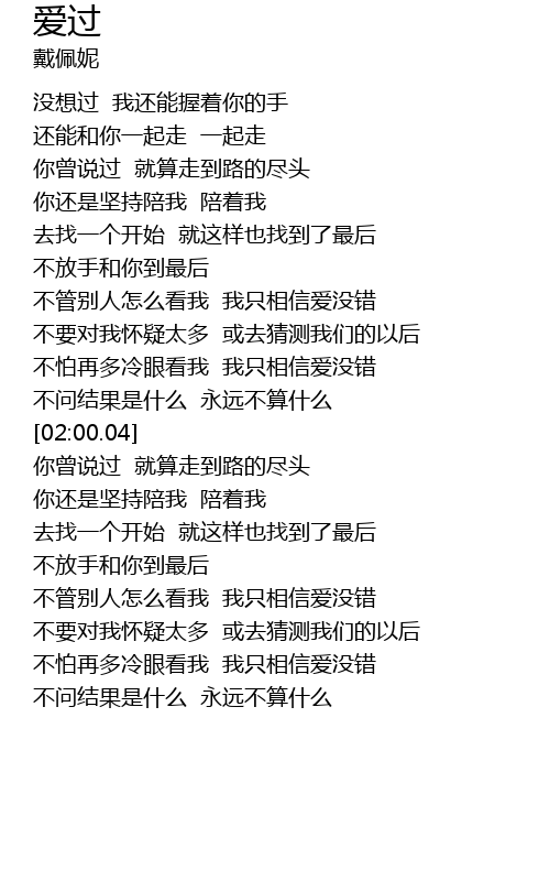 | [02:58.44] | 不要对我怀疑太多 或去猜测我们的以后 |