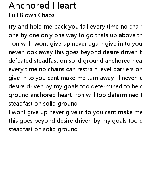 try and hold me back you fail every time no chains can restrain level barriers one by one only one way to go thats up above the rest breath through every wall iron will i wont give up never again give in to you cant make me turn away ill never look away this goes beyond desire driven by my goals too determined to be defeated steadfast on solid ground anchored heart try and hold me back you fail every time no chains can restrain level barriers one by one i wont give up never give in to you cant make me turn away ill never look away this goes beyond desire driven by my goals too determined to be defeated steadfast on solid ground anchored heart iron will too determined to be defeated anchored heart steadfast on solid ground |