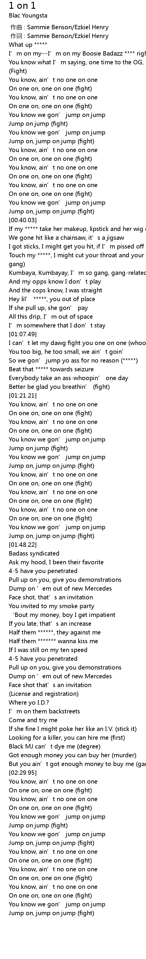 | [02:51.44] | On one on, one on one (fight) |