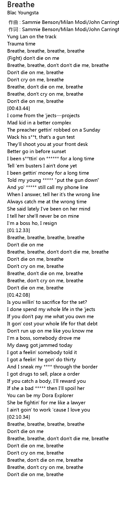 | [01:19.37] | Breathe, breathe, don' t don' t die me, breathe |