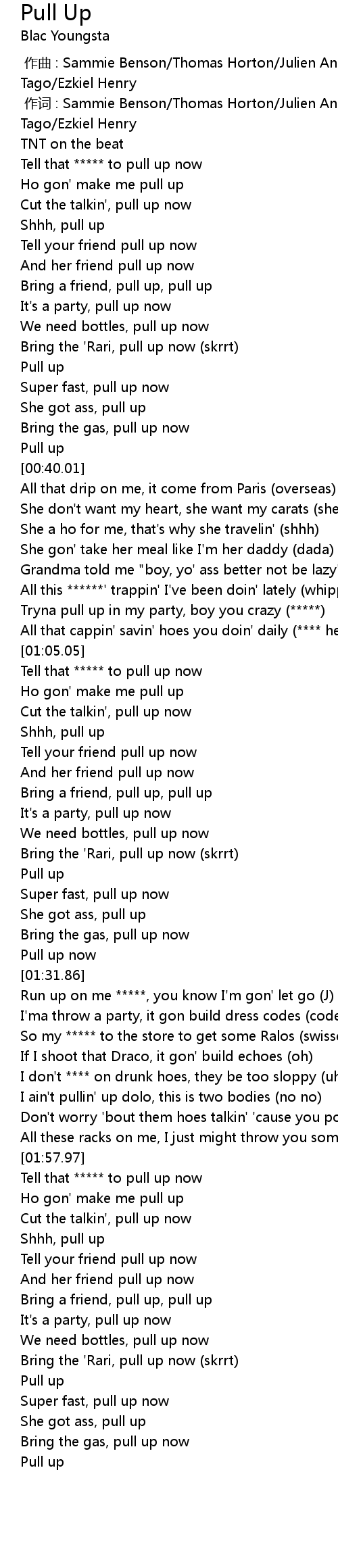 | [01:58.27] | Tell that ***** to pull up now |