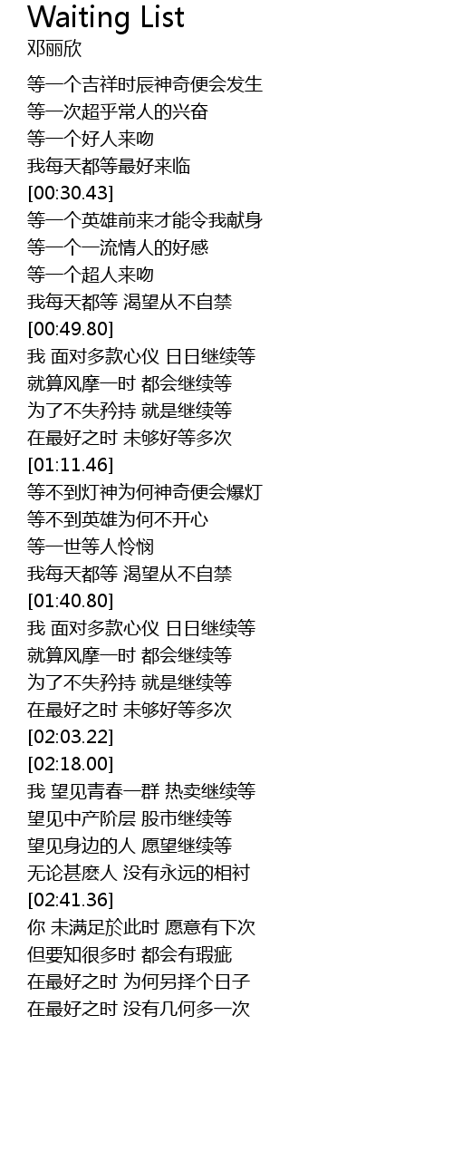 | [01:41.55] | 我 面对多款心仪 日日继续等 |