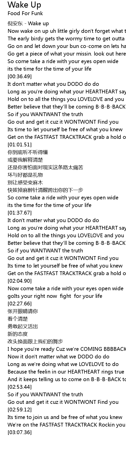 | [00:12.13] | Now wake on up uh little girly don't forget what they said |