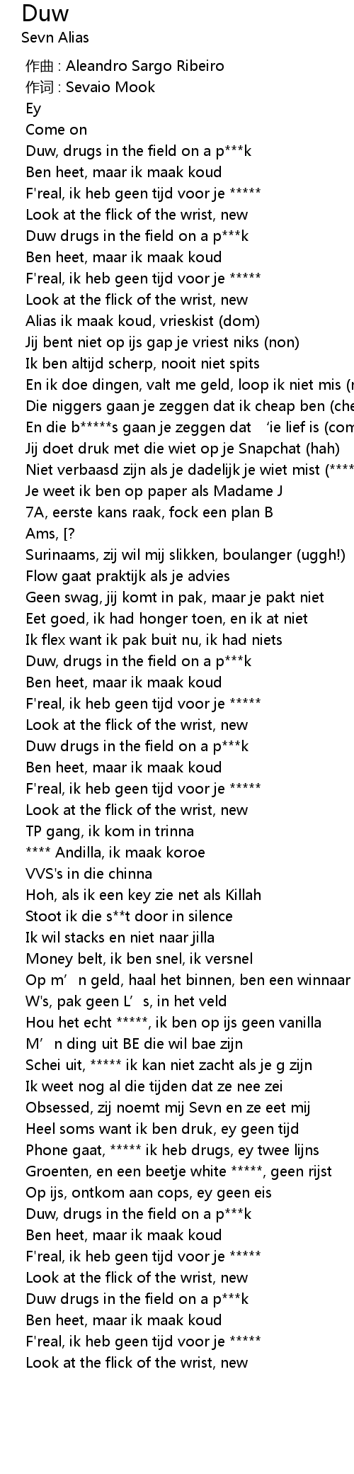 | [01:48.265] | Schei uit, ***** ik kan niet zacht als je g zijn |