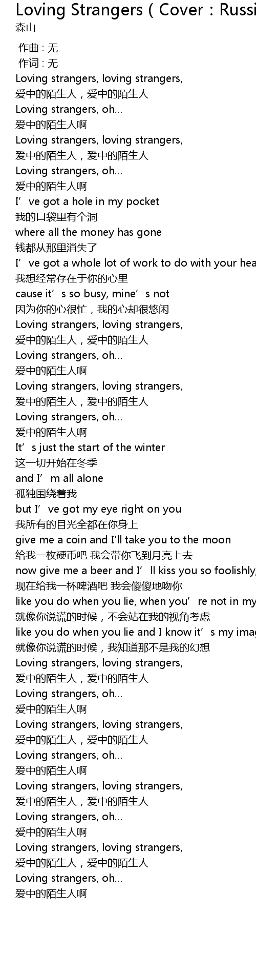 | [02:35.406] | Loving strangers, loving strangers, |