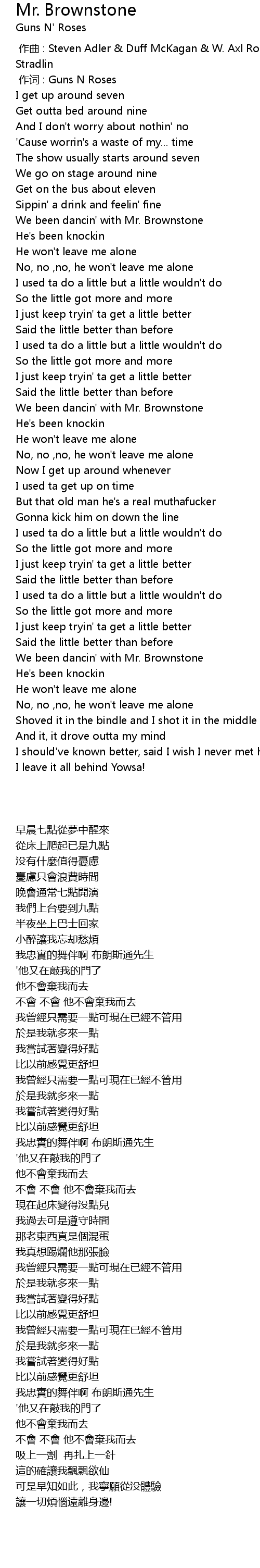 | [00:00.00] | zuo qu : Steven Adler Duff McKagan W. Axl Rose Slash Izzy Stradlin |
