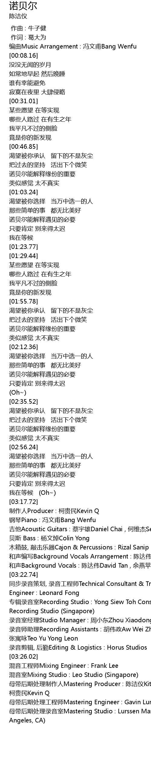 | [03:20.00] | 吉他Acoustic Guitars : 蔡宇雄Daniel Chai , 何维杰Sebastian Ho |