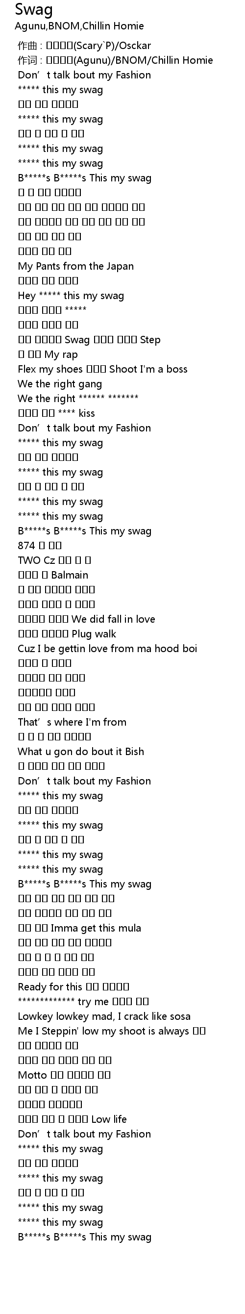 | [01:01.042] | B*****s B*****s This my swag |