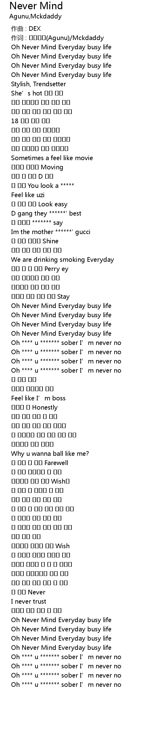 | [00:01.000] | 作词 : 에이건누(Agunu)/Mckdaddy |