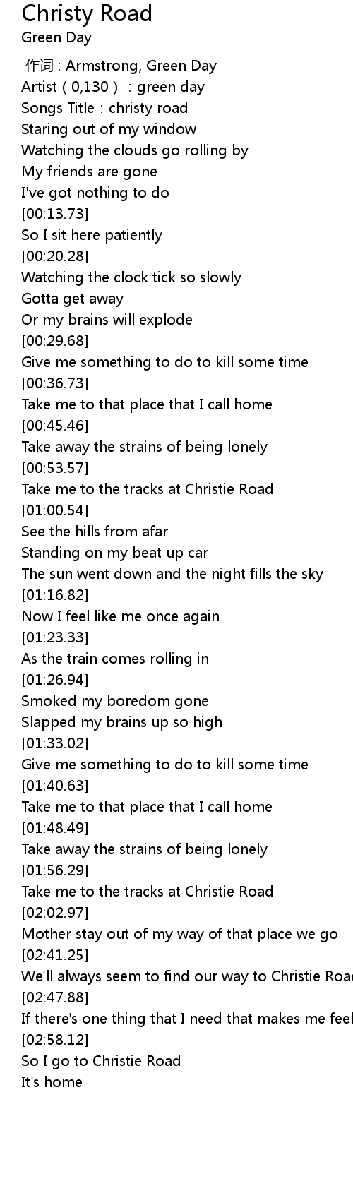 | [02:42.50] | We'll always seem to find our way to Christie Road |