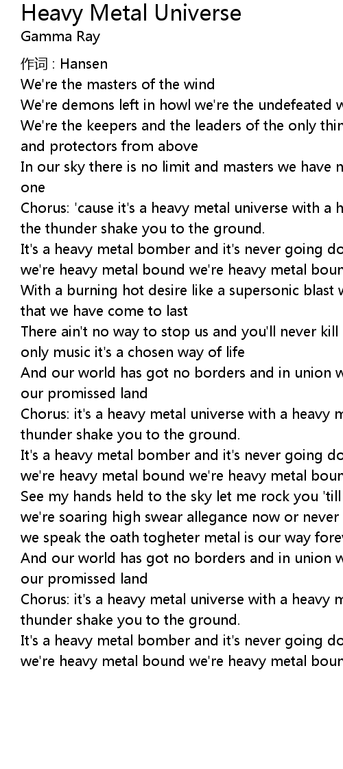 | Chorus: it' s a heavy metal universe with a heavy metal sound masters of the thunder shake you to the ground. | |