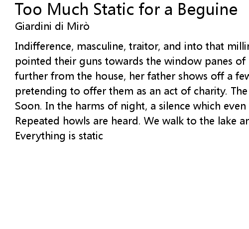 | Indifference, masculine, traitor, and into that milling swarm the enemies pointed their guns towards the window panes of our rooms. Tonight, a few meters further from the house, her father shows off a few gold english coins, pretending to offer them as an act of charity. The winter must be in the house. Soon. In the harms of night, a silence which even crickets don't dare profane. Repeated howls are heard. We walk to the lake and sink into the frozen water. Everything is static |