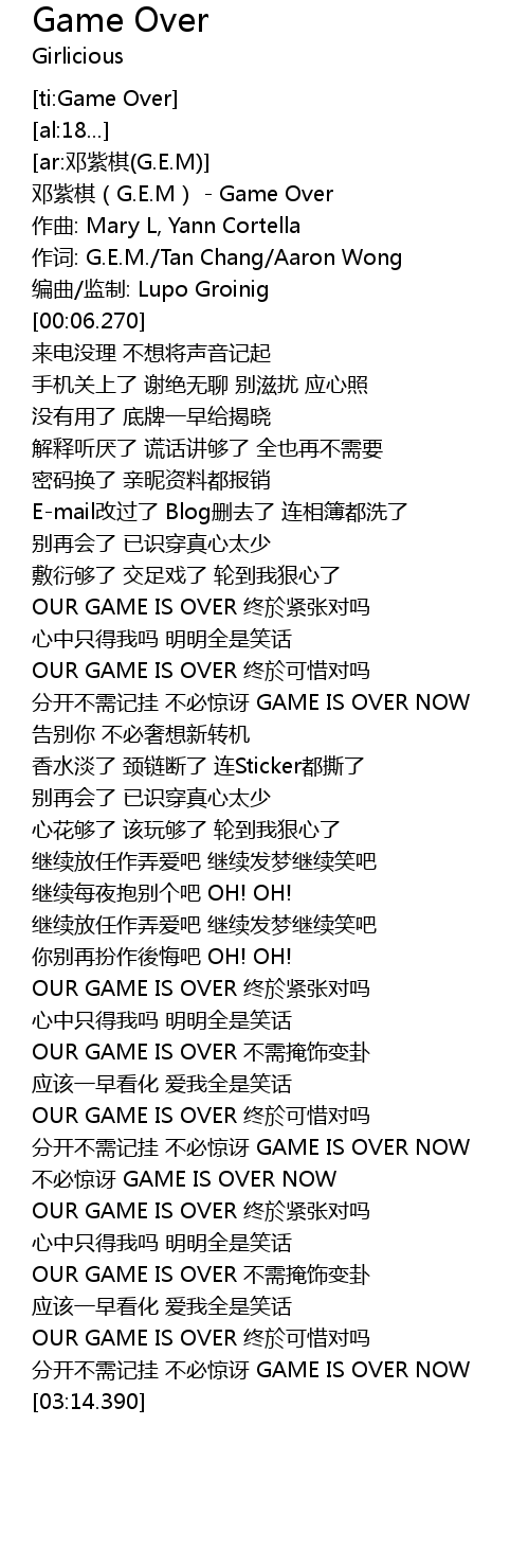| [00:00.580] | 邓紫棋(G.E.M) - Game Over |